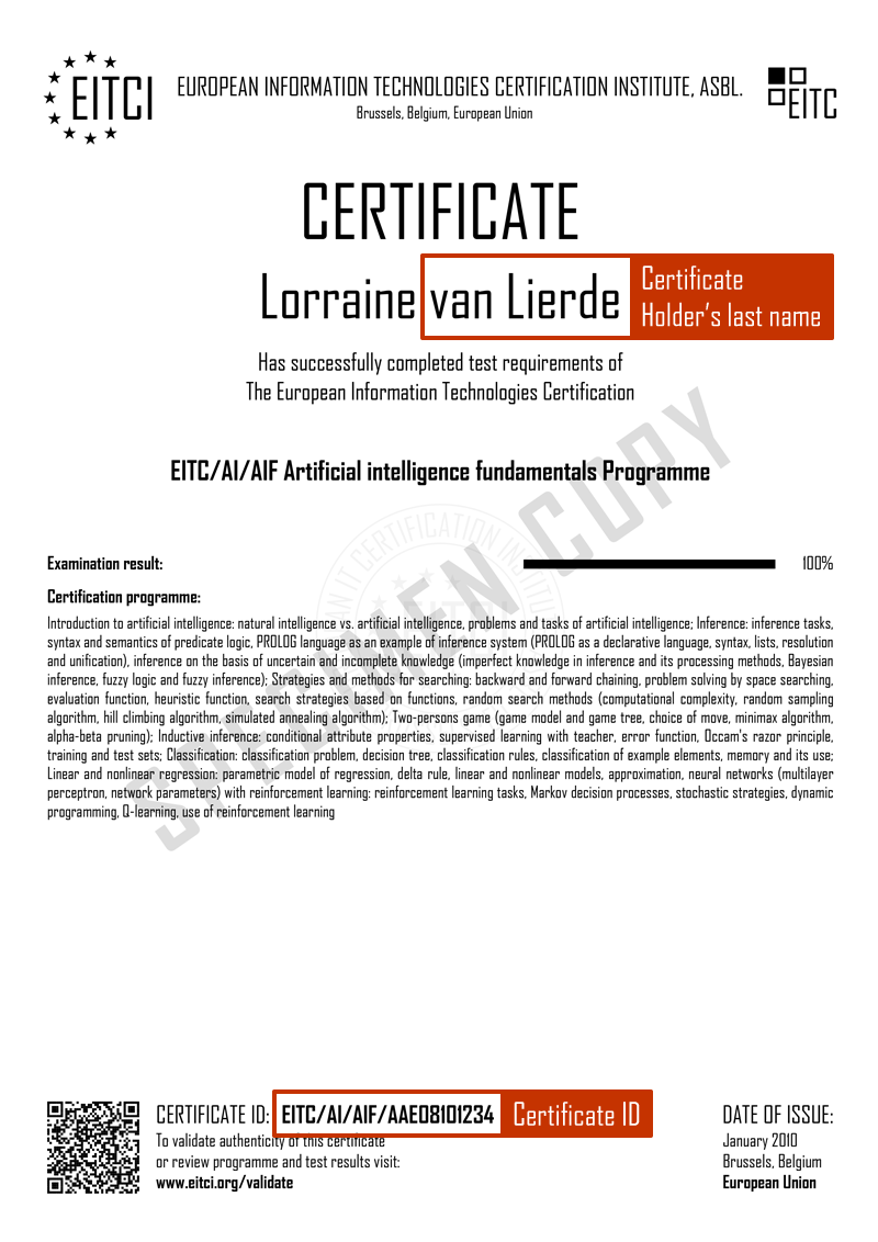 - EITCI come organizzazione europea senza scopo di lucro che mira alla diffusione internazionale di competenze digitali di alta qualità oneri per la certificazione, attestante il raggiungimento delle competenze corrispondenti, copertura dei costi delle procedure di certificazione (in inglese con riferimento alle autotraduzioni assistite da IA) e relative infrastrutture