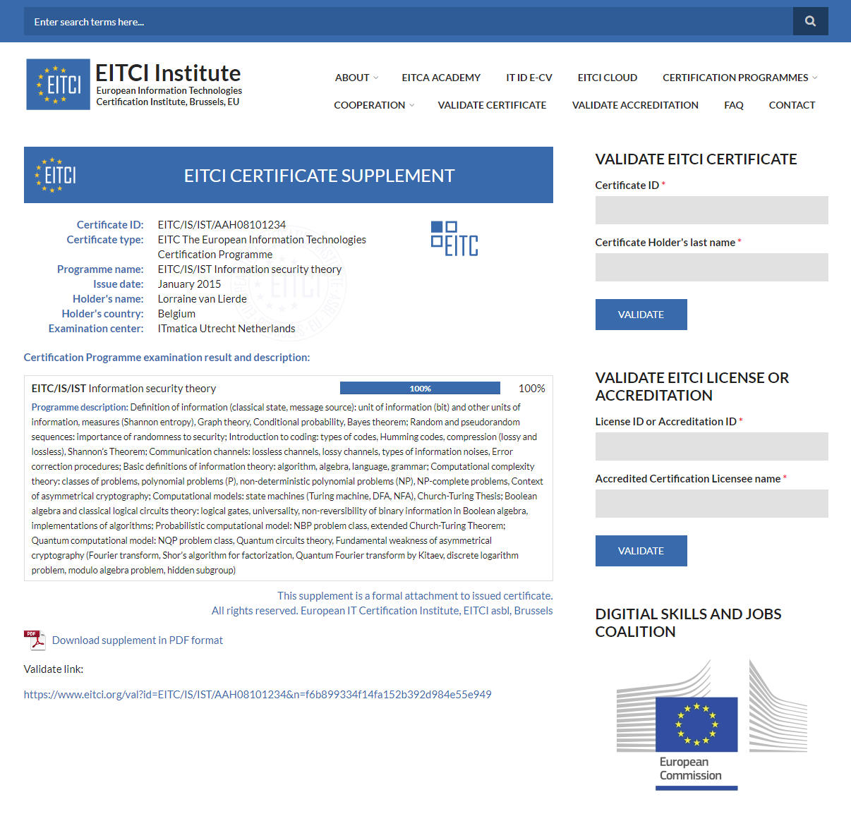 - Con l'EITCI che sostiene l'iniziativa Digital Skills and Jobs Coalition della Commissione Europea, le tasse di certificazione EITCA sono sovvenzionate al fine di sostenere il colmare il divario di competenze digitali (i sussidi EITCI DSJC sono disponibili a livello globale e nel caso in cui un partecipante interrompa il programma non ci sono requisiti per restituire il sussidio)